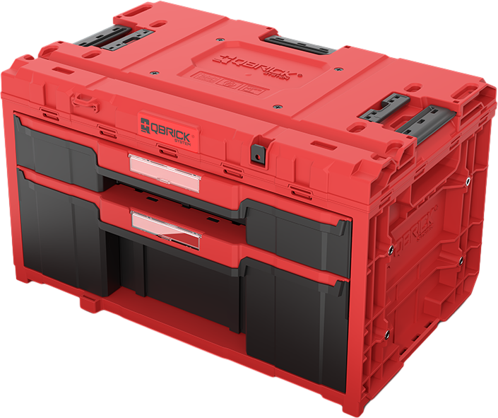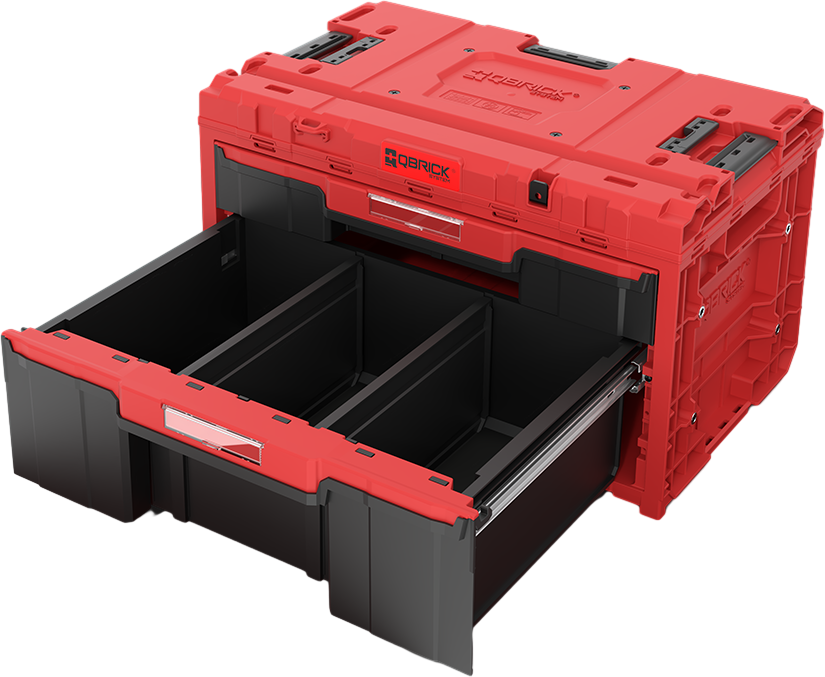 Qbrick System ONE Drawer 2 Plus Toolbox Red Ultra Heavy Duty je iznimno prostrana, modularna kutija za alat opremljena s dva ladica koja se glatko izvlače na metalnim vodilicama. Praktično gumbom omogućuje jednostavan pristup sadržaju oba ladica – donje i gornje. Donja ladica uključuje podesive pregrade od ABS-a (3 duge i 8 kratkih), koje omogućuju stvaranje do 12 različitih pretinaca, dok gornja ladica ima 2 duge pregrade za veće alate ili materijale.