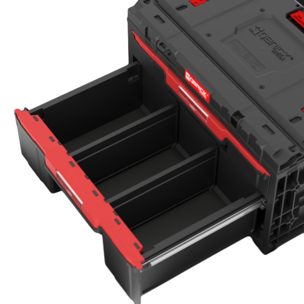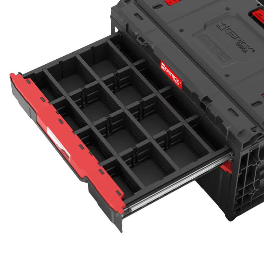 Qbrick System ONE Drawer 2 Plus Toolbox 2.0 je prostrana i modularna kutija za alate dizajnirana za zahtjevne profesionalce kojima je potrebno pouzdano skladištenje na svakom gradilištu. Kutija je opremljena s dvije ladice na metalnim vodilicama – jedna viša i jedna niža – što omogućuje jasnu organizaciju i jednostavan te brz pristup alatima i priboru. Unutrašnjost se može prilagoditi prema želji pomoću priloženih podesivih pregrada, što osigurava da su svi predmeti organizirani i uvijek pri ruci.