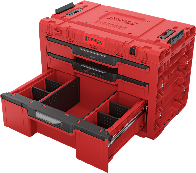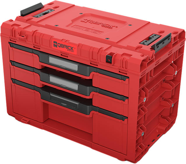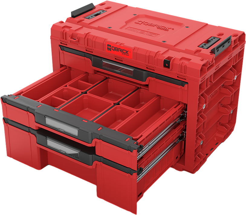 Qbrick System PRIME Drawer 3 Toolbox Expert Red Ultra HD je izuzetno prostrana modularna kutija za alat za zahtjevne korisnike. Sadrži tri ladice na metalnim vodilicama: dvije niske (5,3 L) i jednu srednju (12 L), sve dostupne putem gumba. Svaka ladica ima podesive pregrade i umetke raznih veličina. Niske ladice nose do 4 kg, srednja do 8 kg (ne prelaziti).