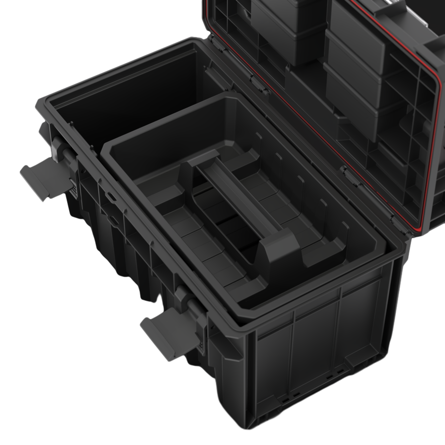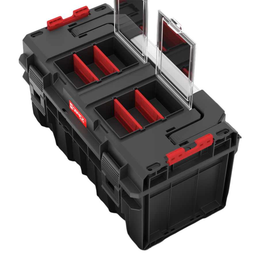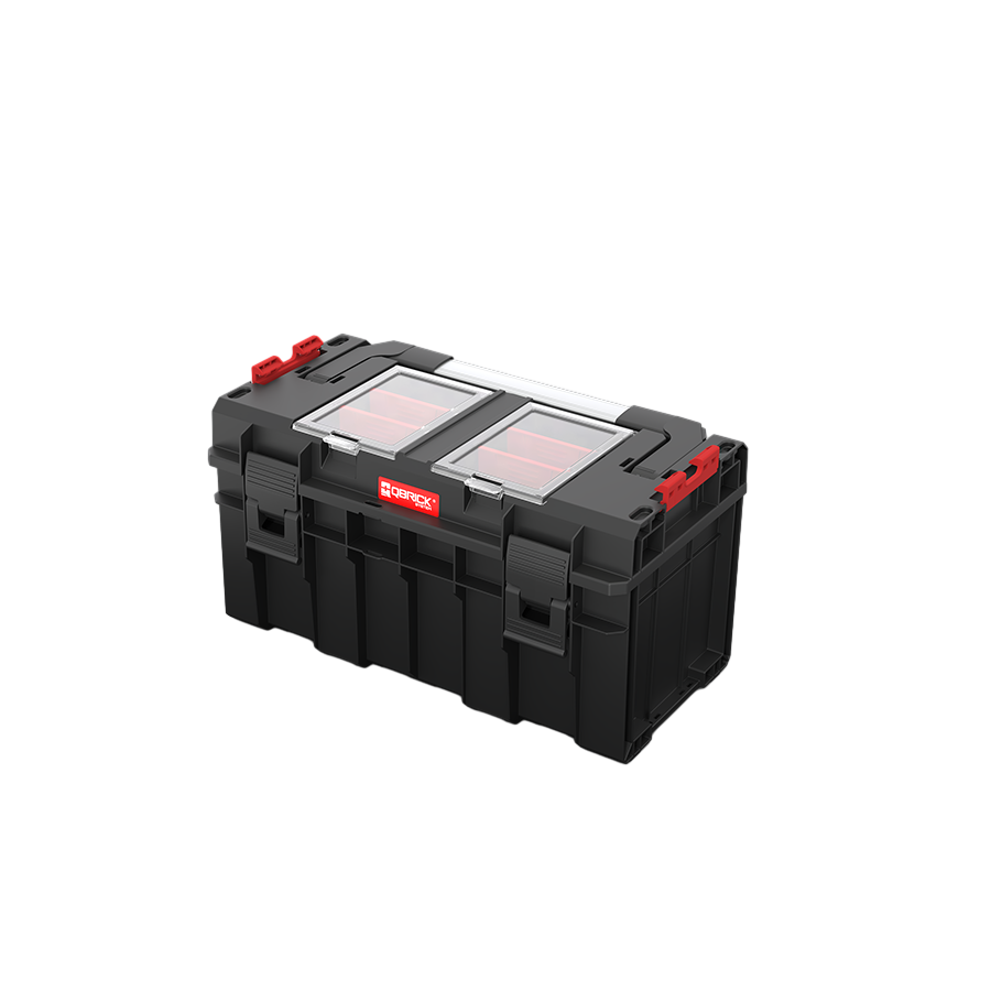 Profesionalna kutija za alate s aluminijskom ručkom, poliamidnim spojkama, fleksibilnom brtvom za otpornost na vodu i prašinu te dva organizatora u poklopcu.