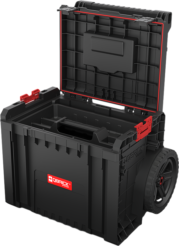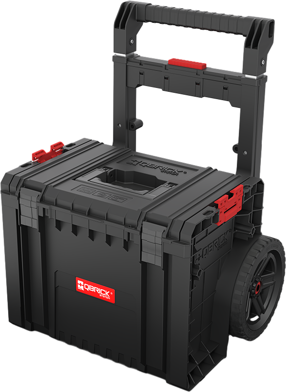 Qbrick System PRO Cart 2.0 Plus je mobilni spremnik na kotačima dizajniran za siguran i udoban prijevoz alata čak i u najzahtjevnijim uvjetima. Opremljen je dvostrukom, uklonjivom teleskopskom ručkom i udobnim naslonom za noge, koji osiguravaju čvrst hvat i jednostavno manevriranje u skučenim prostorima. Veliki kotači od 9 inča, široki gotovo 6 cm i prekriveni debelim slojem gume, osiguravaju izvrstan oprijem i glatku vožnju čak i po najzahtjevnijem terenu.