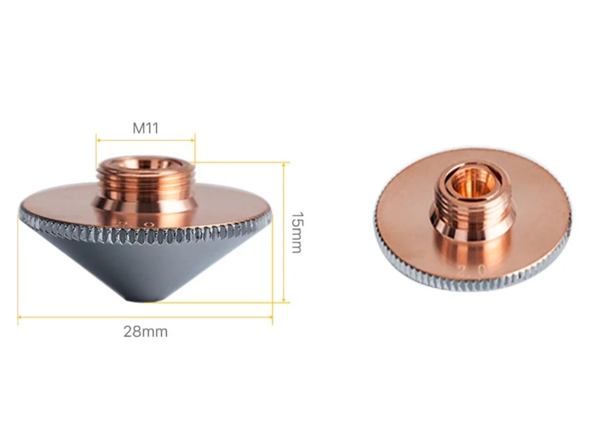 Dvoslojna konstrukcija omogoča optimalen pretok plina, kar zagotavlja čiste in ostre reze pri obdelavi ogljikovega jekla. Premer šobe je 28 mm, višina 15 mm, navoj M11. Različne velikosti kalibra (običajno od 0,8 do 6,0 mm) omogočajo prilagoditev različnim potrebam rezanja in različnim debelinam materiala rezanja. Šoba je primerna za visoke hitrosti, serijsko proizvodnjo in zahtevno industrijsko uporabo.