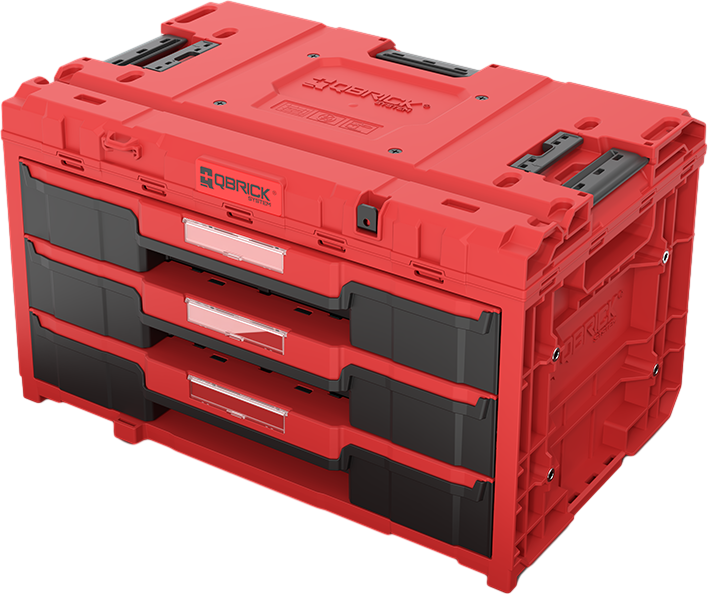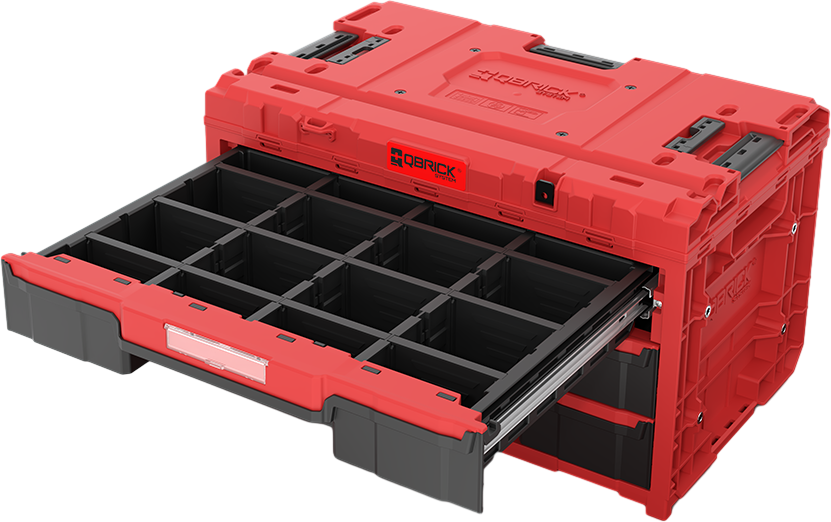 Qbrick System ONE Drawer 3 Toolbox Red Ultra Heavy Duty je izjemno prostoren, modularni zaboj za orodje, opremljen s tremi nizkimi predali, ki se gladko izvlečejo po kovinskih vodilih. Priročen gumb omogoča enostaven dostop do vsebine vseh treh predalov. Predali so opremljeni z nastavljivimi ABS pregradami – trije dolgi in osem kratkih razdelilnikov omogočajo oblikovanje do 12 ločenih prekatov poljubne velikosti.