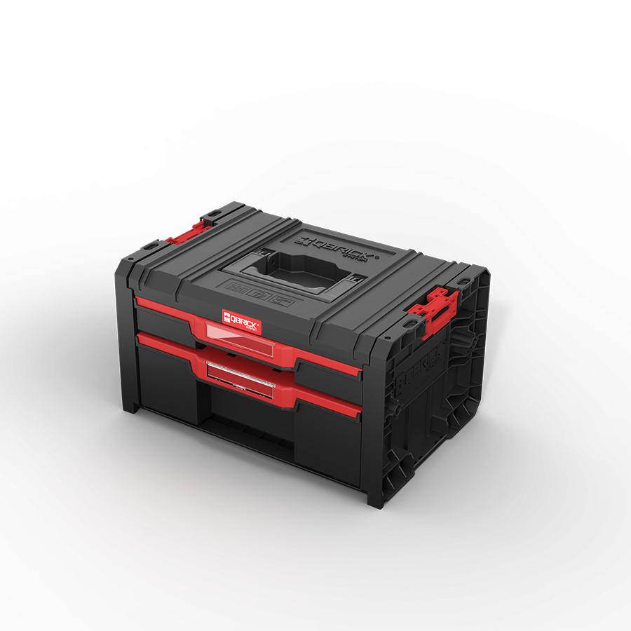 Modularni komplet Qbrick System PRO Drawer Workshop Set 7 s transportno platformo in tremi zaboji s predali. Nastavljive pregrade, avtomatsko zaklepanje in robustna konstrukcija za mobilno in organizirano shranjevanje orodja.